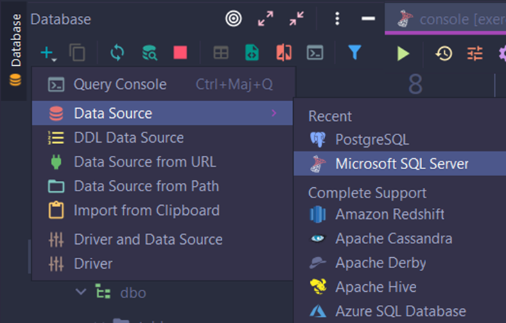 Vous pouvez utiliser n’importe quel outil de votre choix pour ce labo : votre IDE, DBeaver, etc. Dans la suite du laboratoire, vous n’aurez pas besoin d’un outil spécifique. Je vous présente comment faire avec le logiciel DataGrip (que vous pouvez utiliser gratuitement avec votre adresse email d’étudiant).