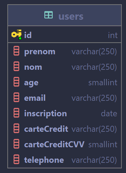 Pour vous éviter de devoir ouvrir le fichier de backup, voici la définition de la table users qui sera utilisée durant ce labo :