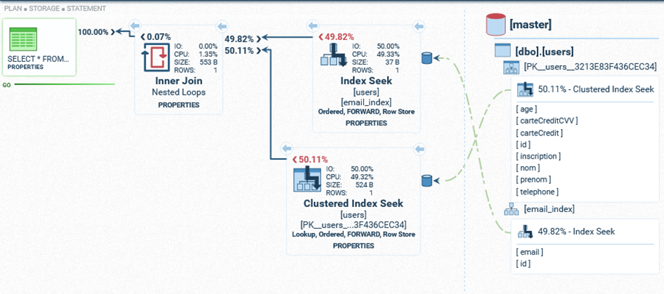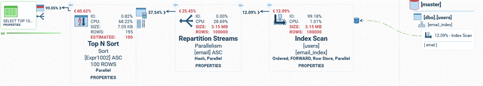 SQL Server va utiliser l’index pour la première partie de la query (SELECT TOP 100 COUNT(*) as nbr, email FROM users GROUP BY email ORDER BY nbr), mais il sera obligé de trier chacune de ces lignes pour le ORDER BY.